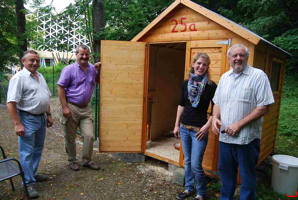 Der nagelneue Hühnerstall, eine prima Unterkunft für die "neuen Bewohner", er hat auch eine Hausnummer, nämlich "Münchshöfen 25 a" (das Heim hat Münchshöfen 25!) bekommen.